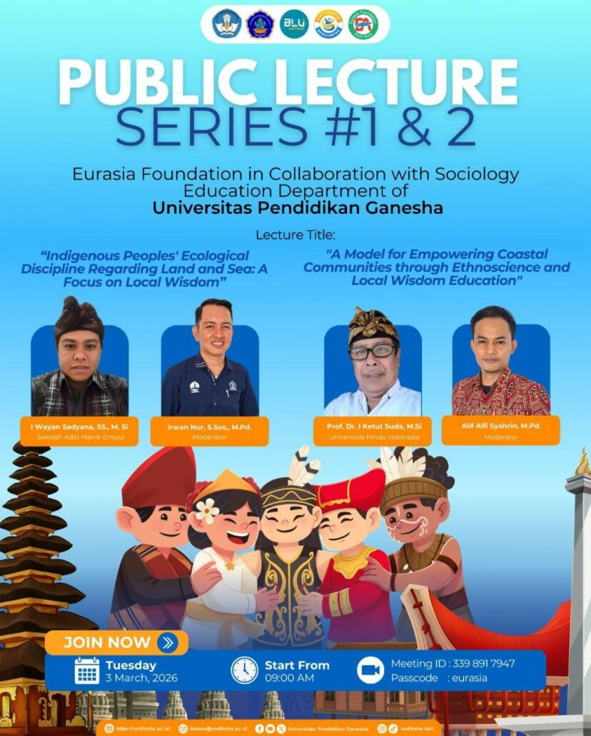 Singaraja, 3 Maret 2026 — Salah satu dosen Program Studi Pendidikan Bahasa Jepang (PBJ) di Universitas Pendidikan Ganesha (Undiksha), yaitu I Wayan Sadyana, SS., M.Si., menjadi pembicara dalam kegiatan kuliah umum yang diselenggarakan oleh Program Studi Pendidikan Sosiologi (PenSos) bekerja sama dengan Eurasia Foundation. Kegiatan tersebut dilaksanakan pukul 09.00 WITA di Gedung Balingkang Confucius Institute Undiksha secara luring dan daring. Kuliah umum kali ini mengangkat tema “Asia Ethnoscience and Local Wisdom.” Dalam kesempatan tersebut, Wayan sensei menyampaikan materi berjudul “Harmoni Semesta: Disiplin Ekologi dan Kearifan Lokal Masyarakat Adat Pedawa.