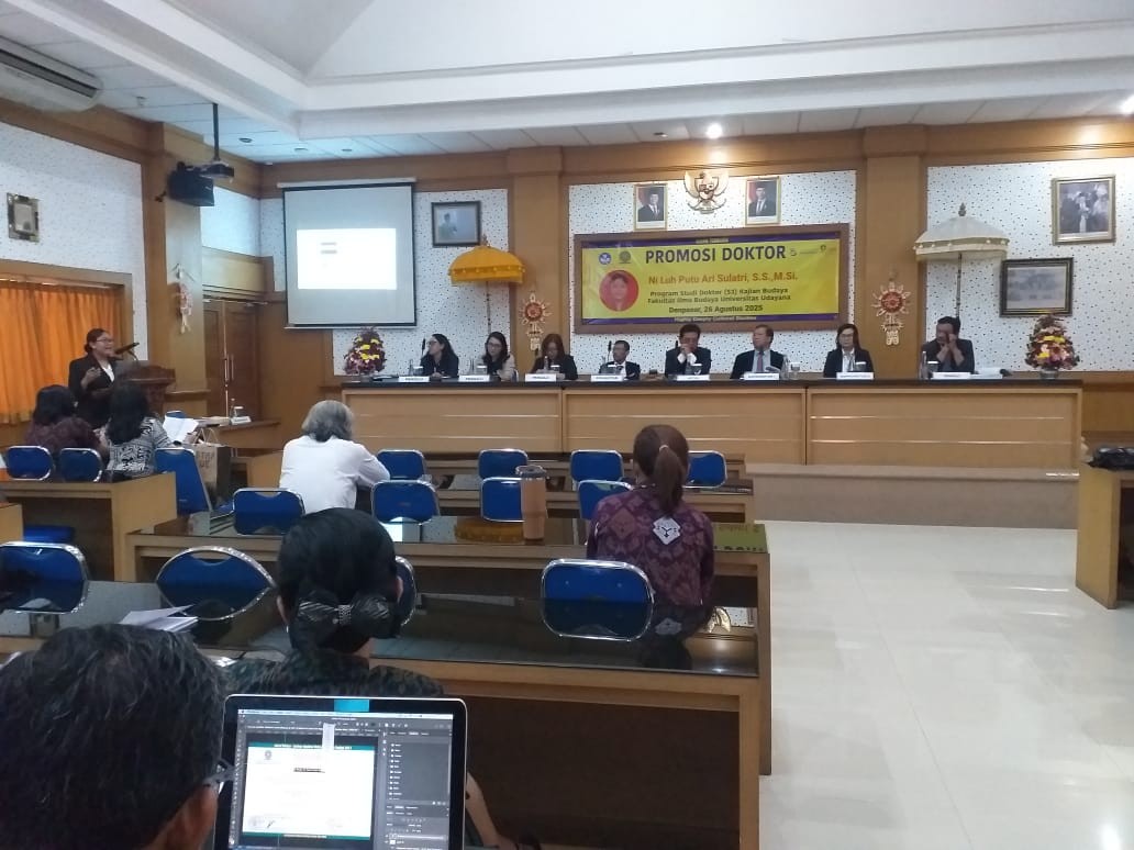 Dewan penguji terdiri dari Prof. Dr. I Nyoman Suarka, M.Hum. (Ketua Sidang), Prof. Dr. A.A. Ngurah Anom Kumbara, M.A. (Promotor), Prof. Dr. I Nyoman Darma Putra, M.Litt. (Ko-Promotor 1), Dr. Ida Ayu Laksmita Sari, S.Hum. (Ko-Promotor 2), Dr. Ni Ketut Puji Astiti Laksmi, S.S., M.Si., Dr. Ni Luh Ramaswati Purnawan, S.S., M.Com., Dr. Nanang Sutrisno, S.Ag, M.Si., serta Dr. Kadek Eva Krishna Adnyani, S.S., M.Si. selaku penguji eksternal dari Undiksha Singaraja.