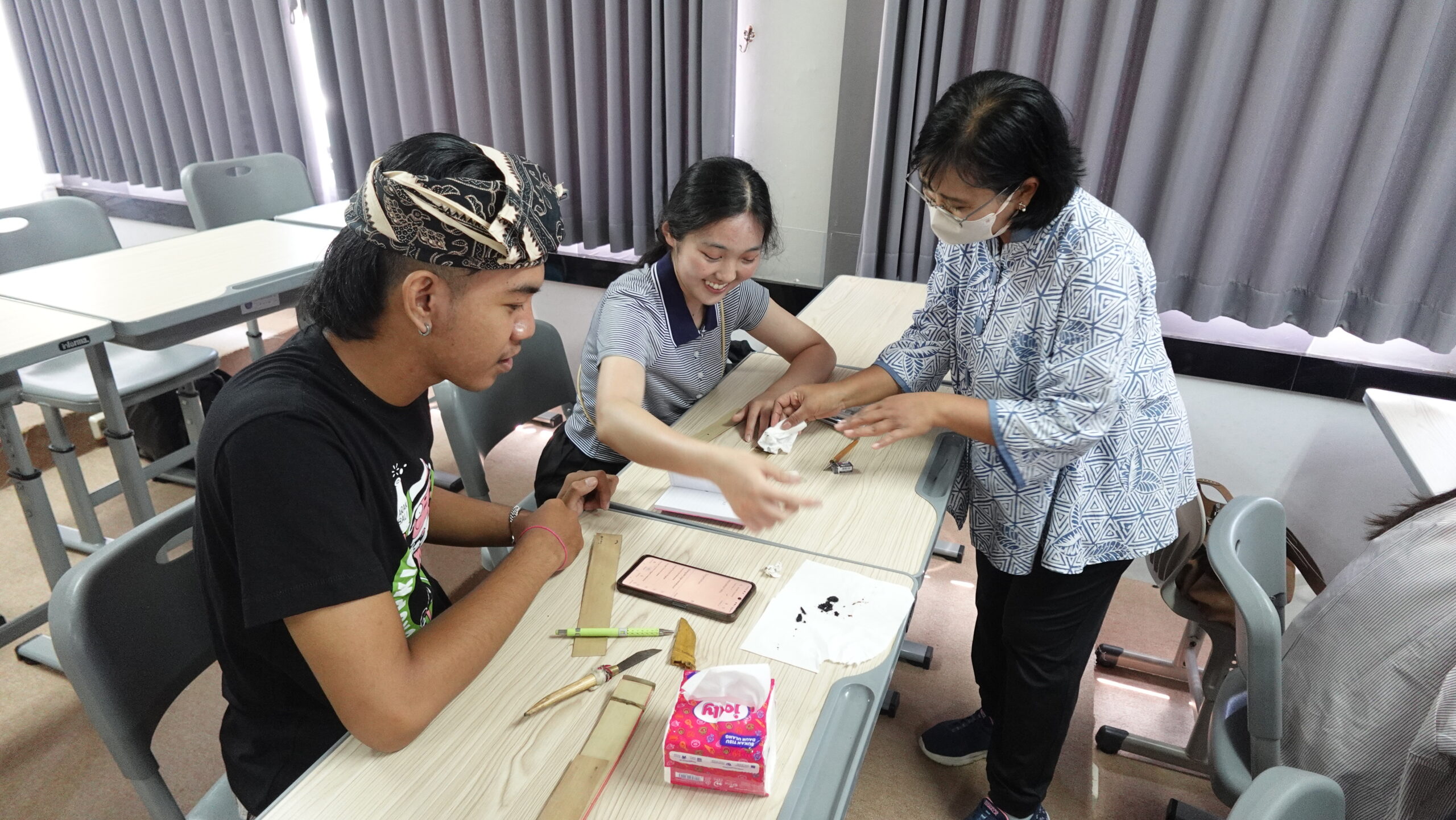 Bertempat di salah satu ruang kelas pada pukul 10.00-11.30 WITA, 7 mahasiswa Iwate University, yaitu Taito Sagara, Yuna Takahashi, Ruri Iizuka, Chise Mizuno, Chieri Yokosawa, Yua Suzuki, Rio Kawarahata didampingi oleh perwakilan dosen PBJ, Ni Nengah Suartini, S.S., M.A., Ph.D dan I Kadek Antartika, S.S., M.Hum., mengikuti kegiatan workshop lontar dengan pemateri dosen Pendidikan Bahasa Bali dan DKV FBS Undiksha, Ida Bagus Rai, S.S., M.Pd., Dr. I Nyoman Rediasa, S.Sn., M.Si., dan Dr. Drs. I Ketut Supir, M.Hum.